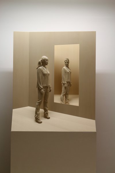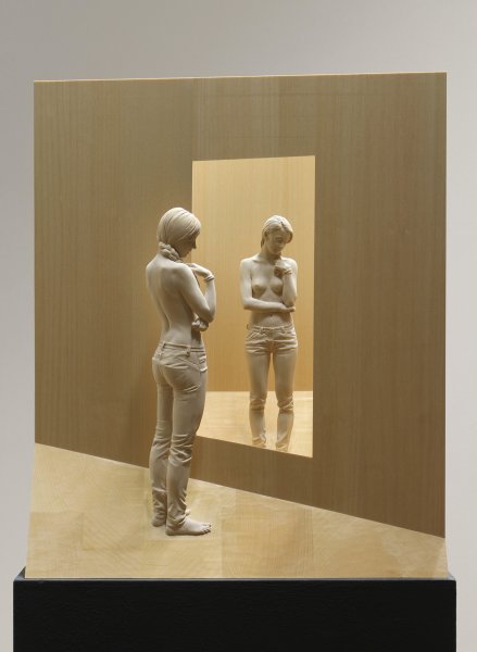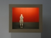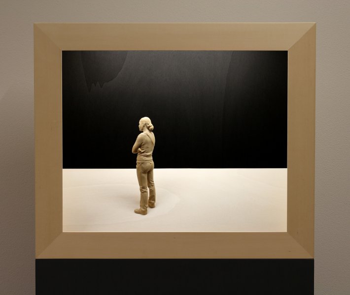 Peter Demetz -  donna che osserva 2014 - tiglio acrilico e neoon - cm 55x65x15,5